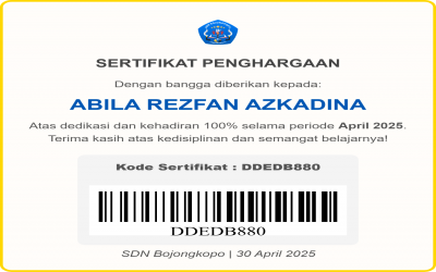 SDN Bojongkopo memberikan apresiasi setinggi-tingginya kepada para siswa hebat yang menunjukkan disiplin dan semangat belajar luar biasa dengan kehadiran 100% selama bulan April 2025! Terima kasih telah menjadi contoh positif bagi teman-teman lainnya